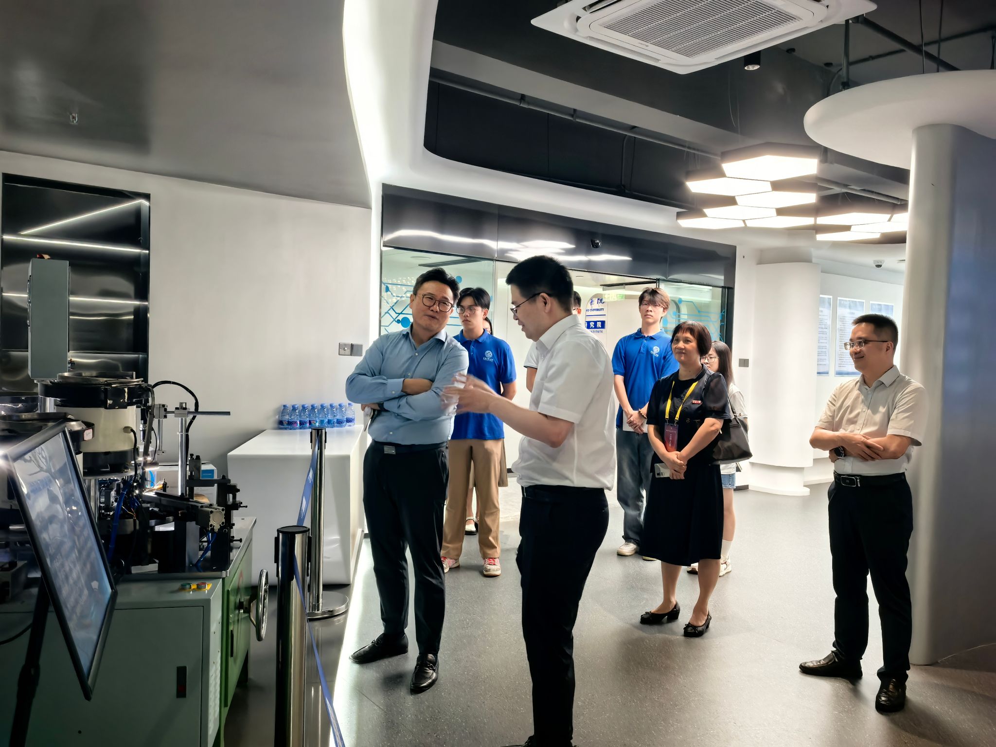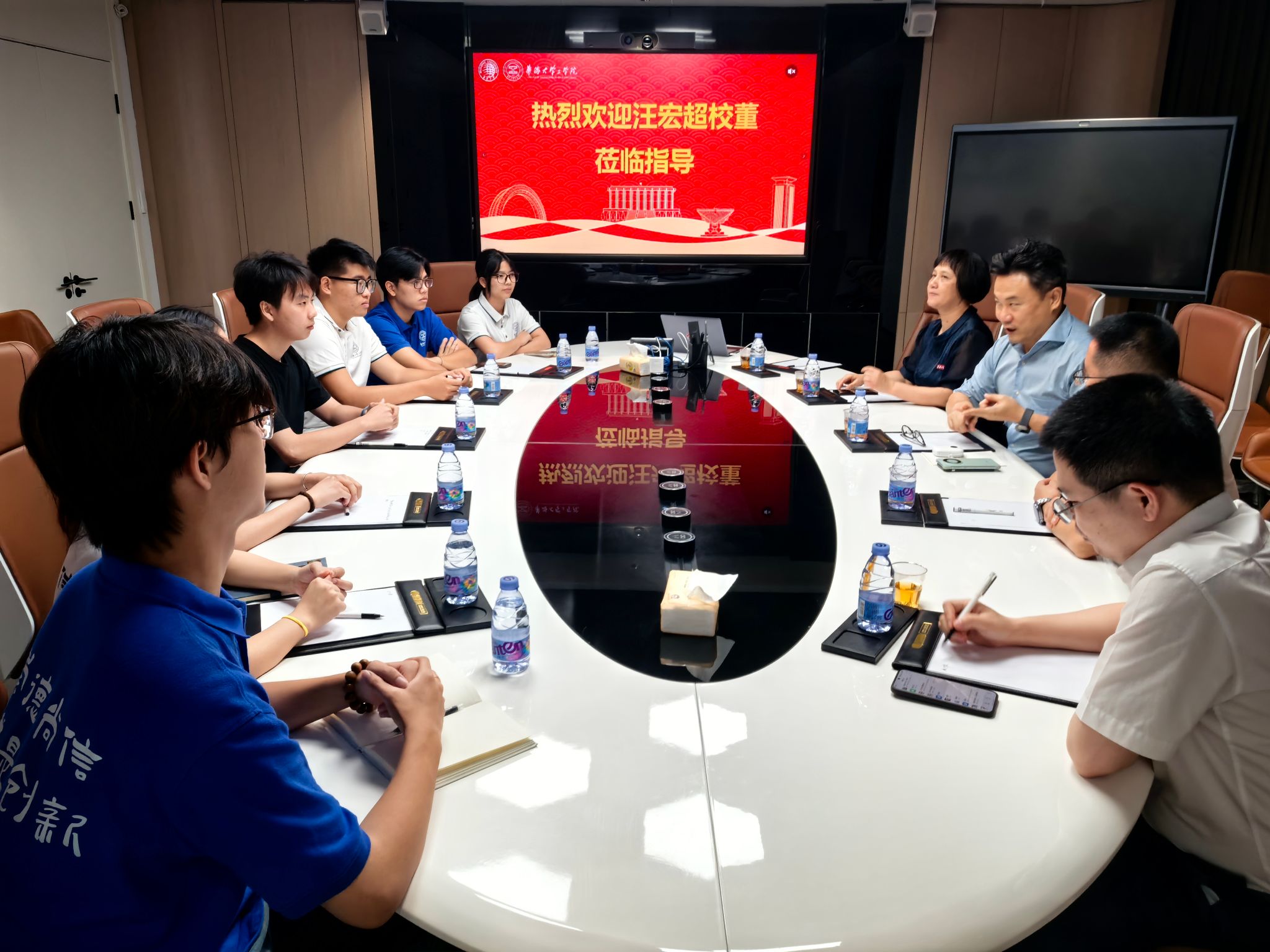 参观后,汪宏超先生与境内外学生代表座谈交流。认真听取了每一位同学的介绍与分享,并结合自身经历给同学们答疑解惑、分享人生感悟。汪宏超先生勉励同学们:“要在人工智能这一大好赛道里学好专业知识,并且提高品德修养,多做利他利人的事。”