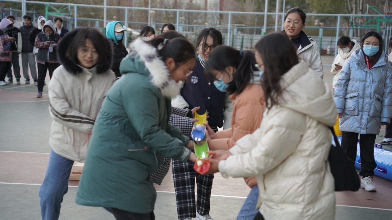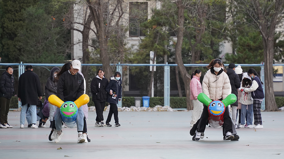 “毛毛虫跑”活动考验团队协作,四名同学坐骑在充气毛毛虫道具上,双手握住毛毛虫的固定把手,通过团队协调配合带动毛毛虫道具快速行驶。同学们配合默契、步调一致,逐渐找到了游戏技巧。