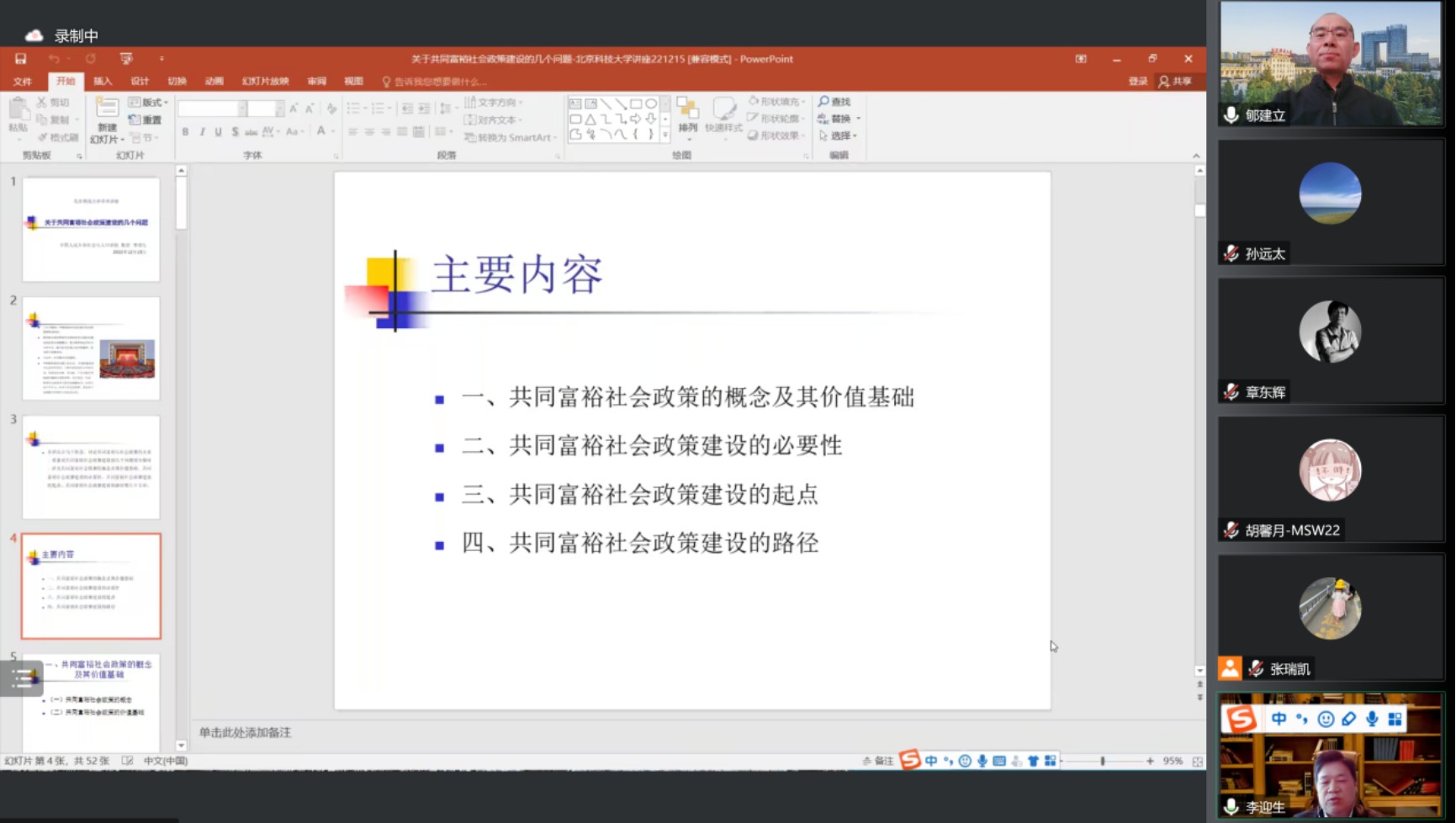 2022年12月15日下午,由北京科技大学社会学系、北京科技大学MSW教育中心主办的北京科技大学社会工作国家级一流本科专业建设系列活动“贝壳社会学前沿论坛”第五期在线上如期举行。中国人民大学二级教授、杰出学者特聘教授李迎生作题为“关于共同富裕社会政策建设的几个问题”的学术讲座,来自中国社会科学院大学、南京大学、新疆大学、上海师范大学、重庆师范大学、陕西师范大学、福建师范大学、广东财经大学、华北电力大学、华南农业大学、山东农业大学,以及北京科技大学等高校的120余名师生参加讲座。本次讲座由北京科技大学社会学系主任郇建立教授主持。