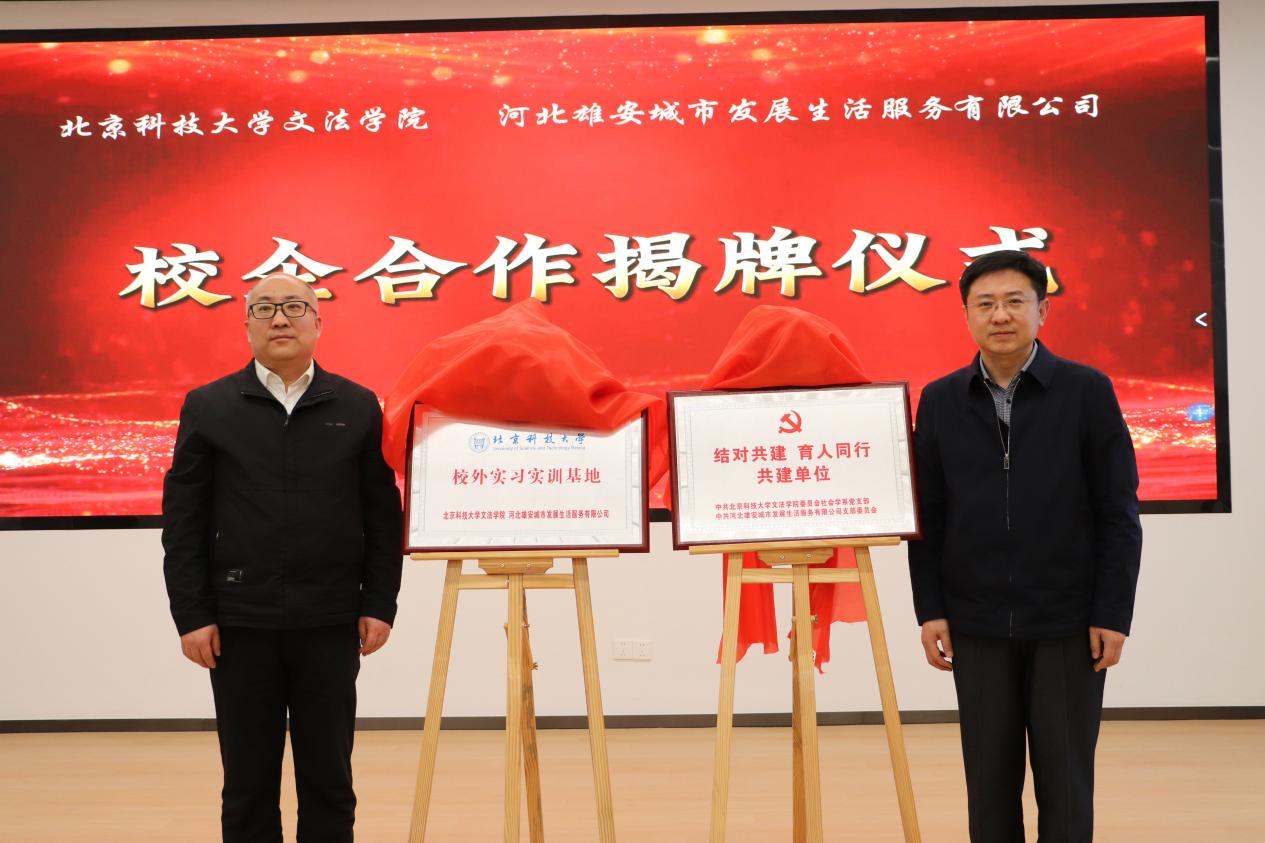 之后,双方就中共河北雄安城市发展生活服务有限公司支部委员会与文法学院社会学系党支部进行党建共建、学生实习就业、科研课题研究等领域的合作进行了充分交流,共同签署了《校企合作备忘录》,举行了“结对共建、育人同行”、“校外实训基地”揭牌活动。