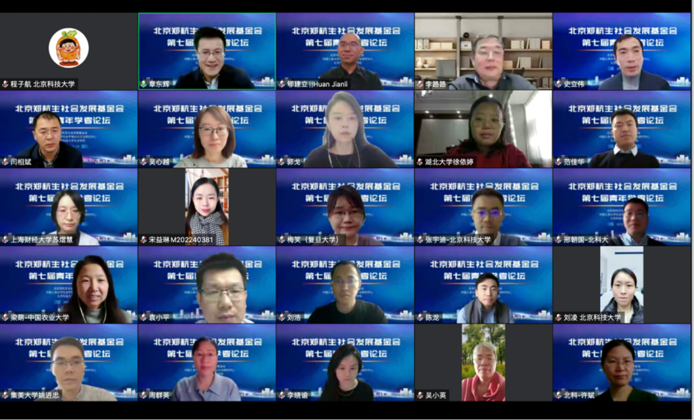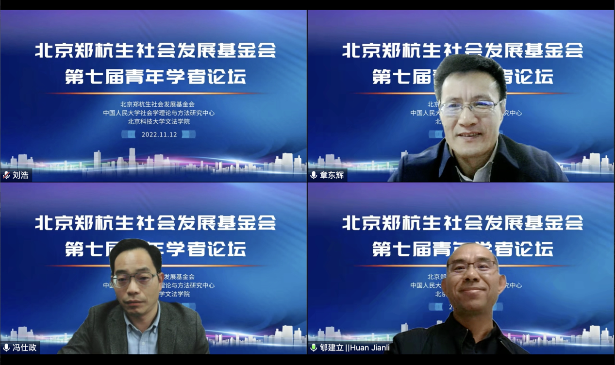 2022年11月12日,北京郑杭生社会发展基金会第七届青年学者论坛以视频会议形式成功举办。本次论坛由北京郑杭生社会发展基金会、中国人民大学社会学理论与方法研究中心和北京科技大学文法学院联合举办。在开幕式上,北京郑杭生社会发展基金会理事长、中国人民大学李路路教授、北京科技大学副校长闫相斌教授与北京科技大学文法学院党委书记史立伟分别致辞。开幕式由北京郑杭生社会发展基金会副理事长、北京科技大学章东辉教授主持。