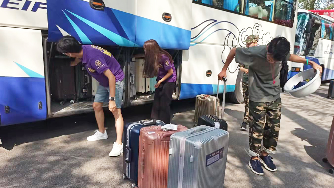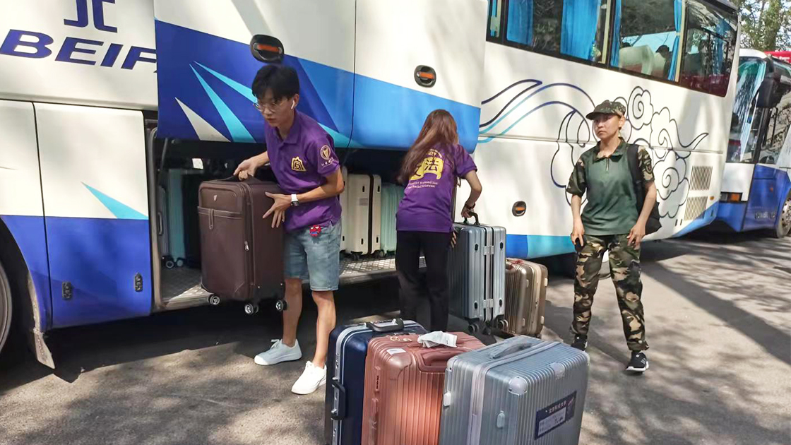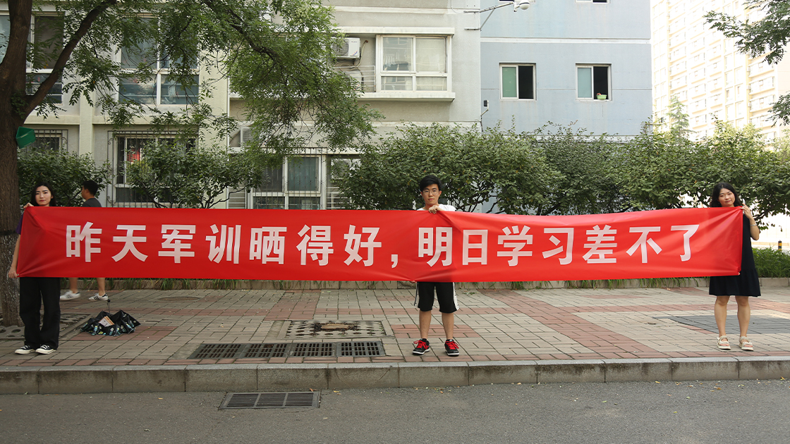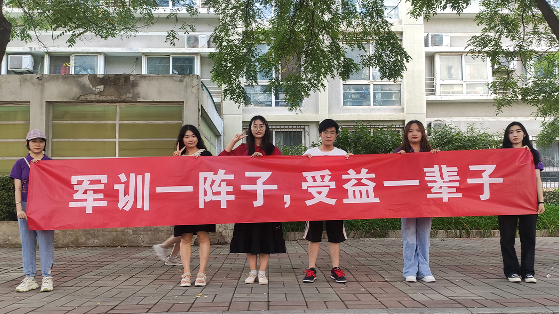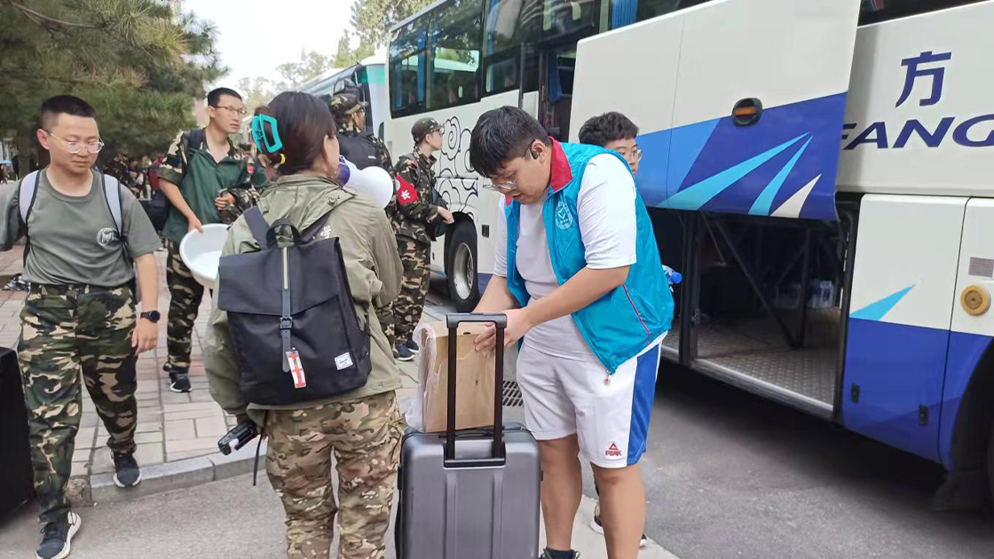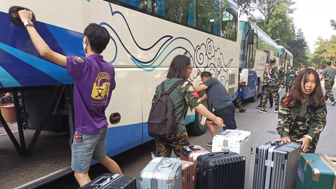 2021年9月11日下午2时许,大巴车车队陆续驶入北科校园,道路两侧,文法学院的志愿者们拉好了横幅,上面写着“军训一阵子,收益一辈子”、“昨天军训晒得好,明天学习差不了”,这寄托了老师与学长学姐们对大一同学的鼓励与期许。