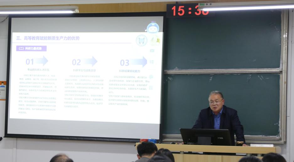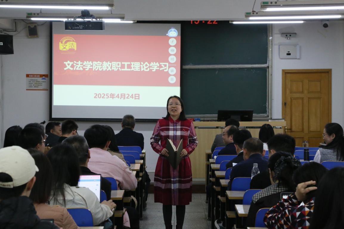 2025年4月24日下午,学院在文法楼301会议室举行教职工理论学习暨“领导干部上讲台”第二期活动。本次学习主要围绕“新质生产力驱动高质量发展”“本科教育教学数字化改革”“社科项目申报策略”三大主题展开。会议由学院党委副书记、行政副院长李虹主持,文法学院全体教职工参加学习。