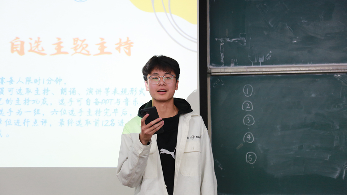 首先是自选主题环节。参赛选手5人一组,每人限时一分钟进行展示。选手们精心准备,选取主持、朗诵、演讲等表现形式来展现自己的主持功底。参赛选手选择的主题充分展示了他们的创造力与参赛热情,趣味性的自我介绍、模仿新闻主播进行播报、诗文朗诵等成为了本次大赛的亮点。