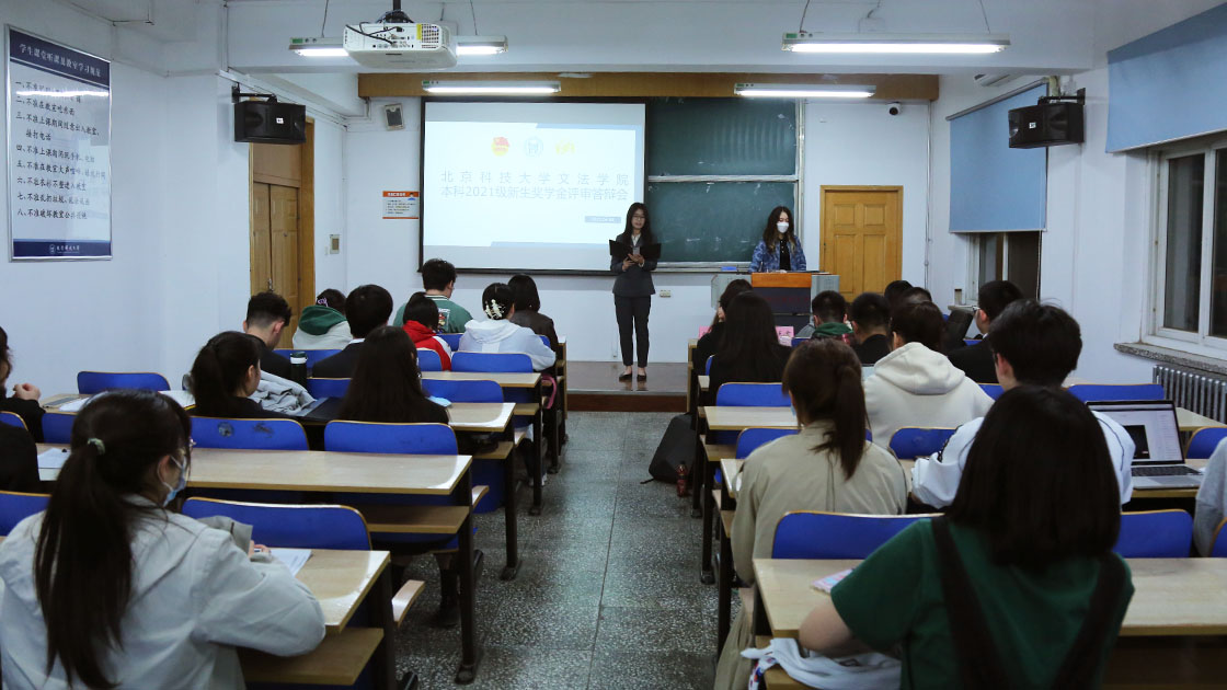 2022年4月8日晚7点,北京科技大学文法学院本科2021级新生奖学金评审答辩会在文法楼301教室举行。文法学院辅导员魏紫彤、刘天雯、孟昕、苏明星、何雅丽以及学生大众评审团出席答辩会并担任评委。