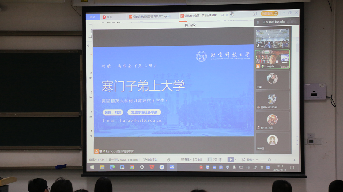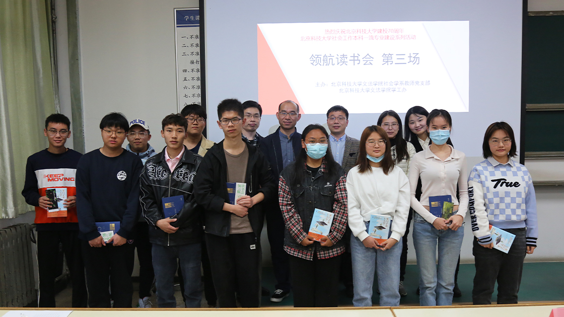2022年4月14日下午3:20,文法学院“领航·读书会”第三场在逸夫楼107教室顺利举办,线上线下200多名师生参加。领航读书会是北京科技大学文法学院社会学系教师党支部和文法学院学工办联合发起的“三全育人”以及“为师生办实事”活动,面向全校学生,通过领读人文社科好书,引领学生读好书,让学生感受读书好,营造好读书的校园氛围,助力建设“书香北科”。此次读书活动也是文法学院喜迎70周年校庆的系列活动之一。