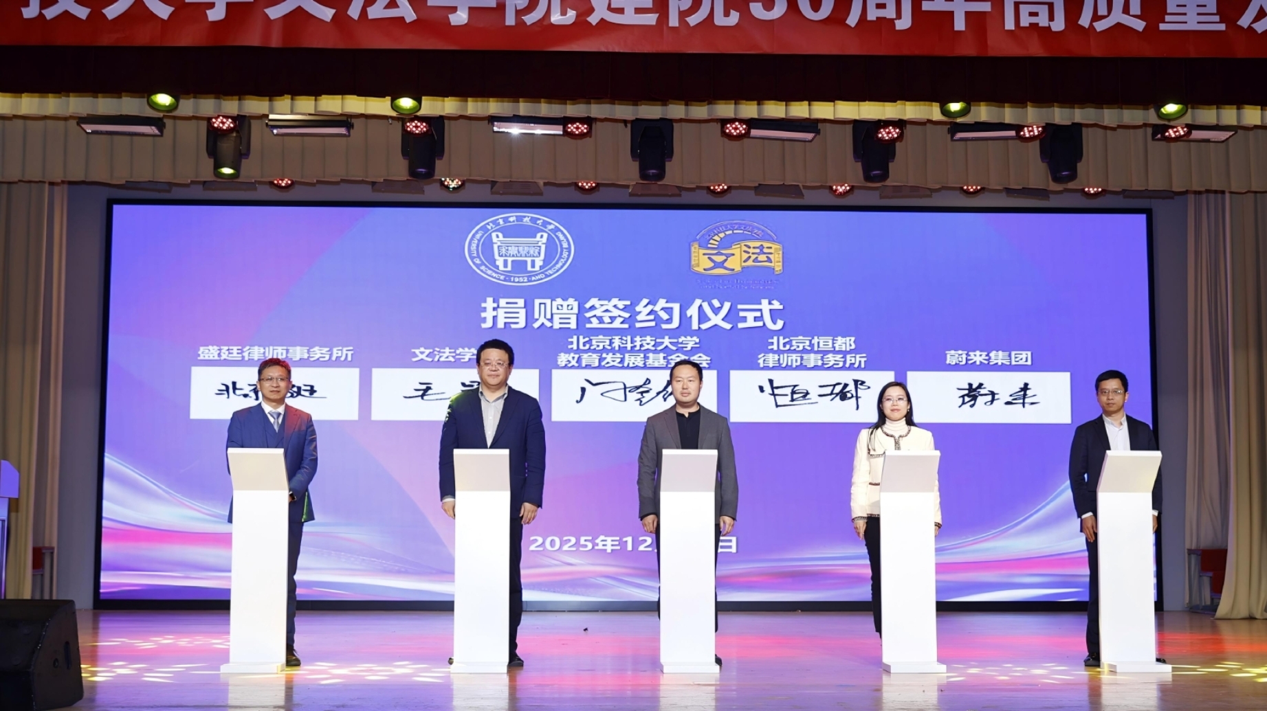 北京恒都律师事务所、盛廷律师事务所、蔚来法律创新研究院代表与学校校友会办公室、基金会办公室主任闫奎铭、文法学院院长毛昊共同上台,启动捐赠合作仪式,携手为学院学科建设和人才培养提质增效。