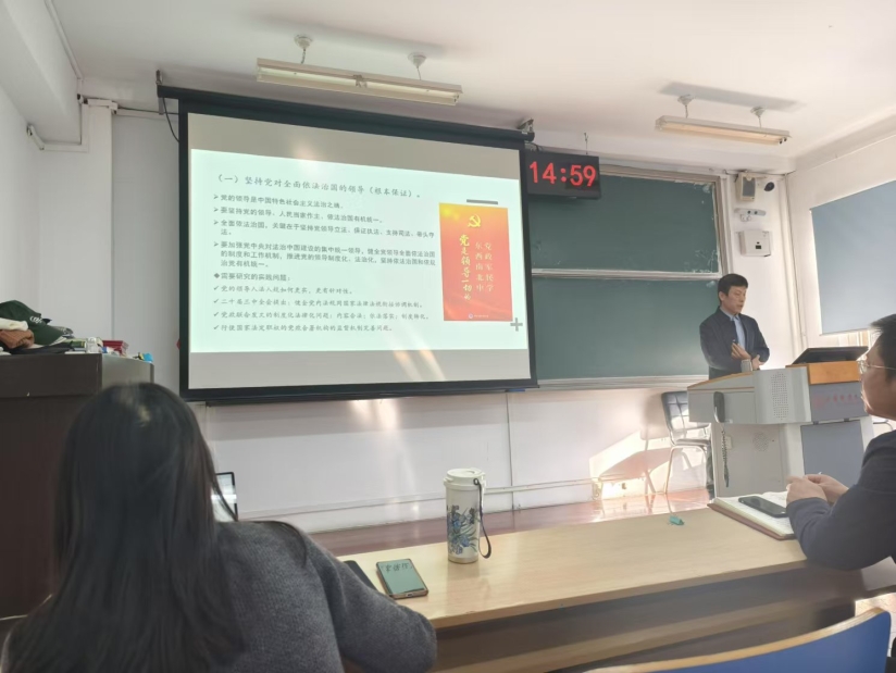 为提升学院全体教职工理论学习水平,增强知识储备、建强思想根基,2025年1月3日下午,学院特别邀请法律系教授李富成为全体教职工主讲以“习近平法治思想”为主题的专题讲座。讲座由学院党委副书记、副院长李虹主持。