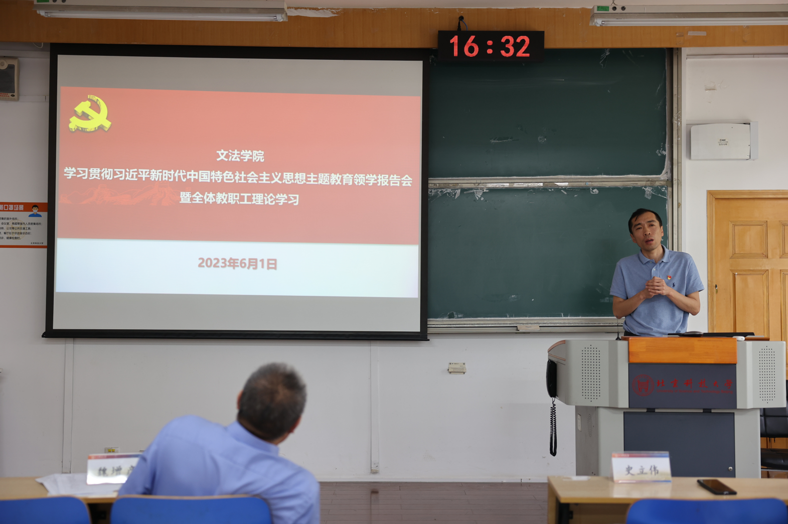 2023年6月1日,文法学院学习贯彻习近平新时代中国特色社会主义思想主题教育领学报告会暨全体教职工理论学习在文法楼301举办,文法学院副院长王霁霞、许斌分别围绕分管工作进行主题报告。文法学院党委书记史立伟与学院领导班子成员、文法学院全体教职工参会,大会由文法学院党委副书记王旭主持。