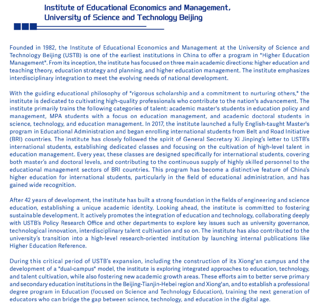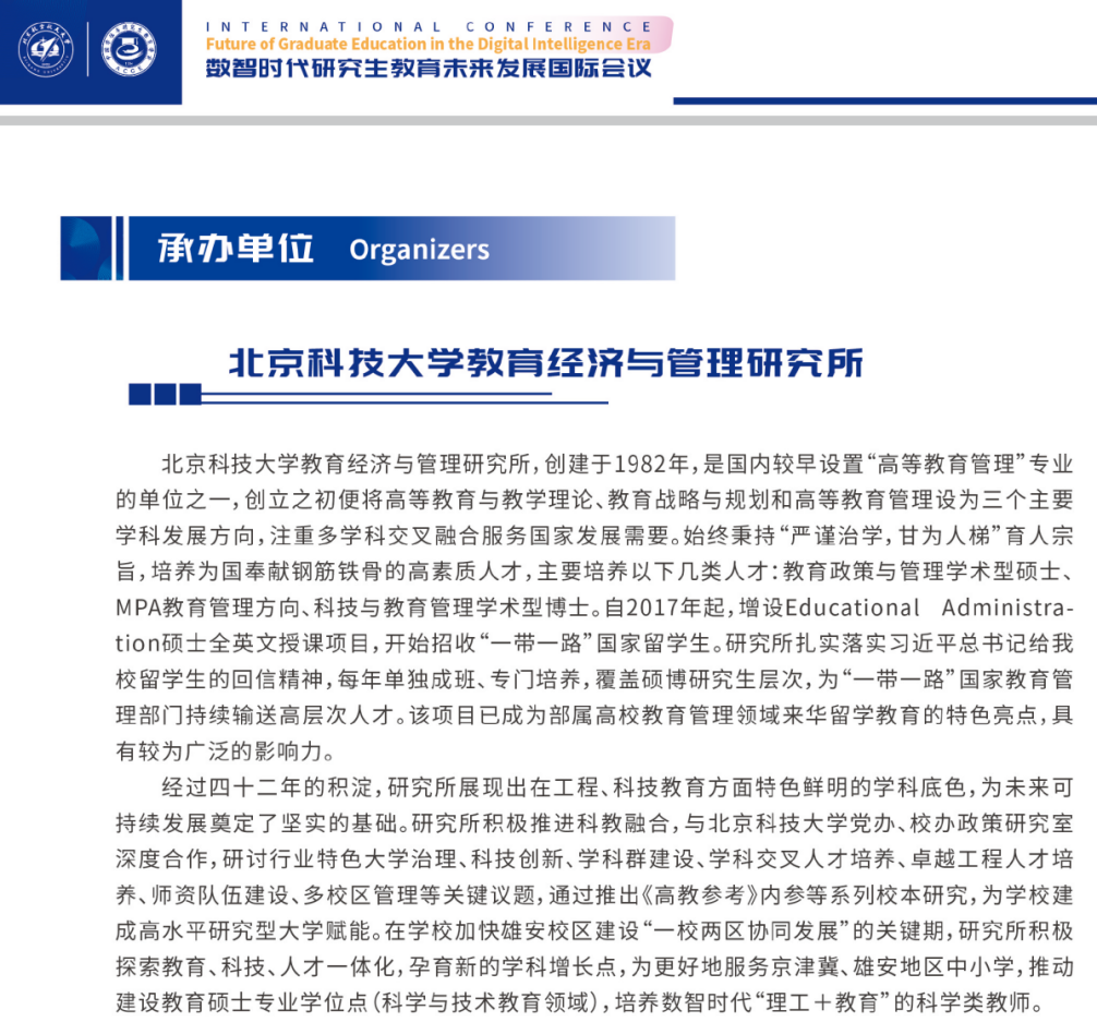 此次会议获得北京科技大学研究生院、国际学生中心来华留学发展项目“培养知华友华的公共管理类来华留学高层次人才”共同资助,研究生院院长林林教授作为特邀嘉宾出席。会议期间,北京科技大学教育经济与管理研究所副所长于苗苗副教授、时悦琪副教授、靳宏老师带领国际学生在内的20余名研究生积极开展多项学术交流活动,展现出教育经济与管理研究所对数智时代研究生教育创新与可持续发展议题的高度关注。以此为契机,教育经济与管理研究所对自2017年起面向“一带一路”等国家国际学生开办的教育经济与管理(全英文授课班、中文授课班均在招生)硕士学位项目“Public Administration(Educational Economics and Management)”,以及教育政策与管理硕士点多学科交叉的人才培养特色,进行了广泛宣传推介,获得了国内外与会人员的高度关注和好评。