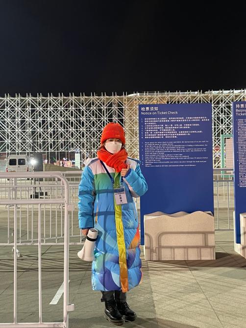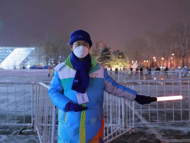 志愿期间,我主要负责在五棵松场馆引导观众进场和散场。难忘我和同组的成员一起在安检口欢迎观众,难忘热情的阿姨同我们挥手、拍照,难忘下雪时观众温暖的问候......我从最初的紧张、生疏逐渐变得从容、熟练,在服务冬奥的同时,这段志愿经历也在治愈着我。