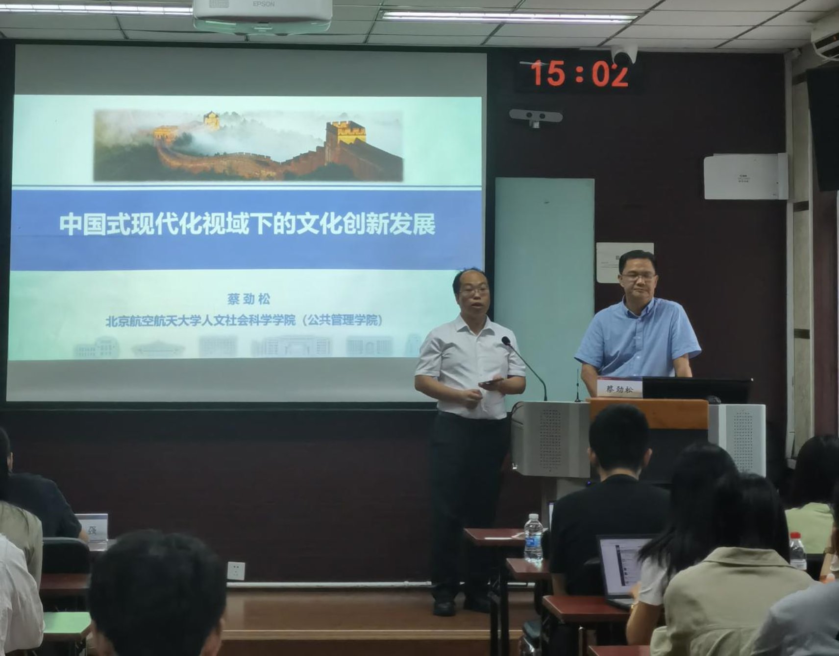 北京航空航天大学人文社会科学学院(公共管理学院)院长蔡劲松教授受邀与青年教师、MPA学员分享中国式现代化背景下如何推进文化自信自强等方面的自我研究, 北京科技大学文法学院成功举办了《中国式现代化视域下的文化创新发展》专题讲座, 其次从四个方面论述文化自信自强何以赋能中国式现代化建设